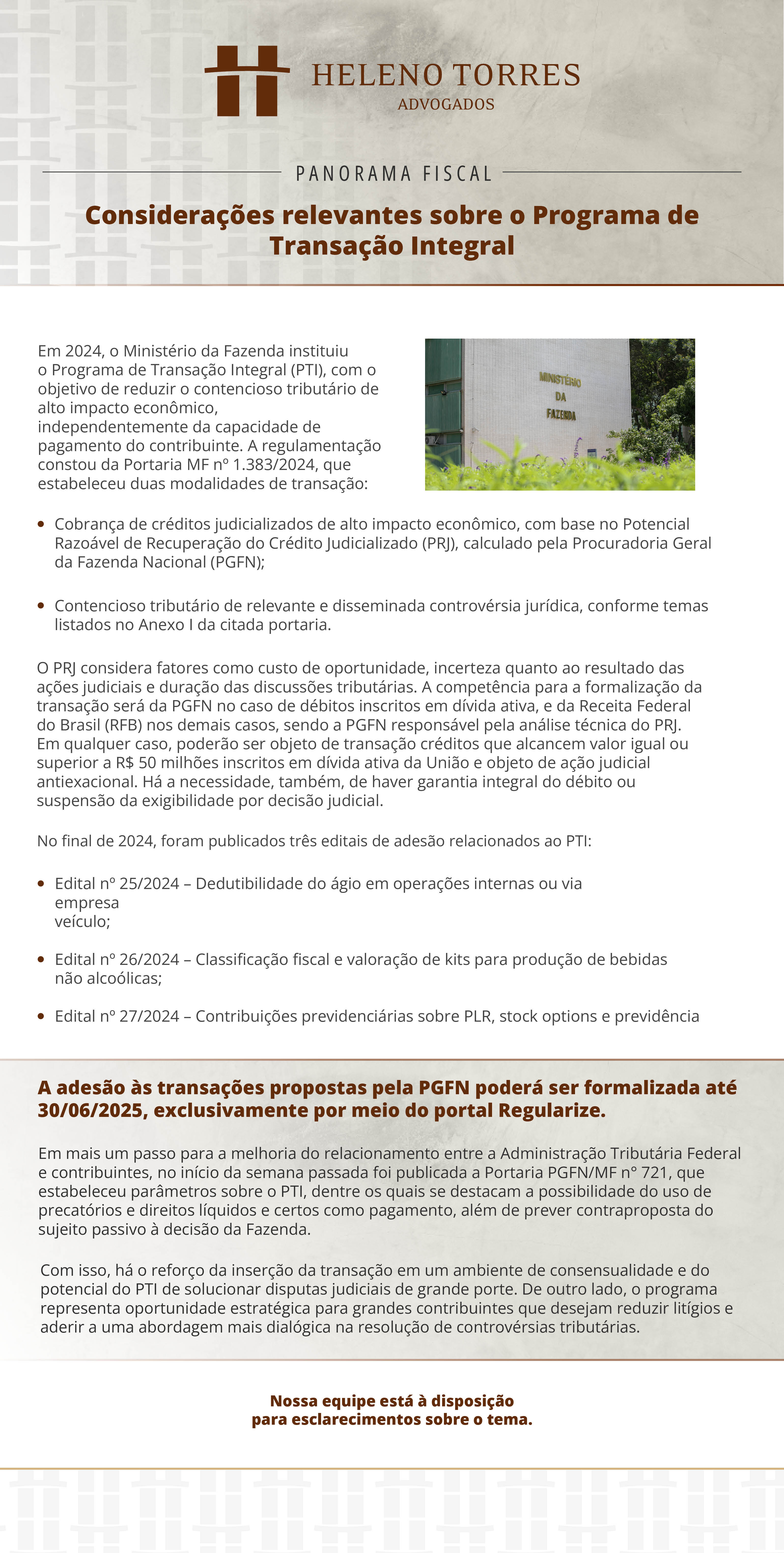 No início da semana passada, foi publicada a Portaria PGFN/MF nº 721, que estabelece parâmetros sobre o Programa de Transação Integral, instituído pelo Ministério da Fazenda em 2024.